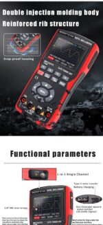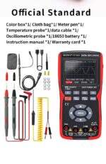 “text”: “يجمع بين وظائف الأوسلسكوب (عرض شكل الموجة، قياس التردد، السعة، إلخ) ووظائف الملتيميتر (قياس الجهد، التيار، المقاومة، السعة، التردد، اختبار الدايود، اختبار الاستمرارية).”