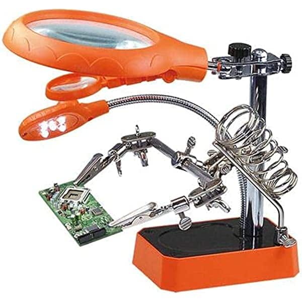 “text”: “بتوفير مكان آمن ومستقر لوضع كاوية اللحام الساخنة، يقلل حامل كاويه من خطر الحوادث. العدسة المكبرة تساعد على رؤية نقاط اللحام والمكونات بوضوح، مما يسمح بإجراء لحامات أكثر دقة ونظافة وتقليل الأخطاء مثل قصر الدائرة أو اللحامات الباردة. الحوامل الإضافية تتيح تثبيت لوحة الدائرة أو المكونات للعمل بكلتا اليدين.”