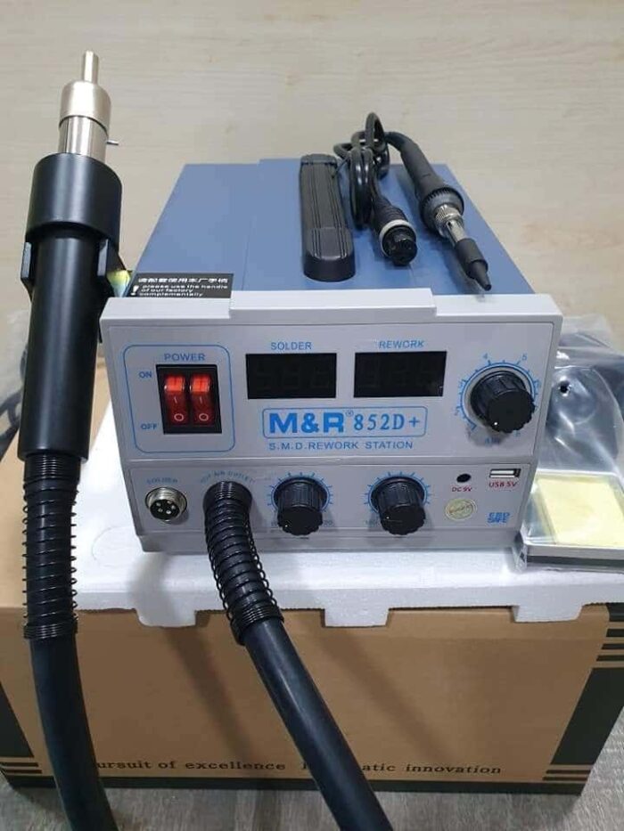 “text”: “هوت اير MR 852D+ هو محطة لحام هواء ساخن احترافية تستخدم لتسخين المكونات الإلكترونية ولوحات الدوائر باستخدام تيار من الهواء الساخن يمكن التحكم في درجة حرارته وسرعة تدفقه. تُستخدم بشكل أساسي لفك وتركيب المكونات الإلكترونية السطحية (SMD).”