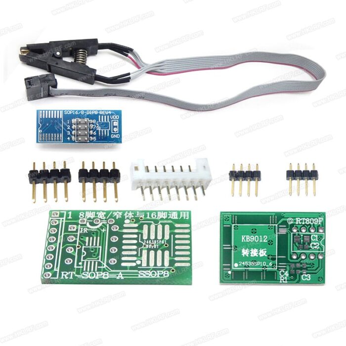 - مقابس ومحولات شاملة: تأتي المبرمجة مزودة بمجموعة واسعة من المقابس (مثل DIP42، TSOP48، SOP44) ومحولات لدعم جميع أنواع حزم الشرائح تقريبًا، مما يلغي الحاجة إلى شراء محولات إضافية بشكل متكرر.