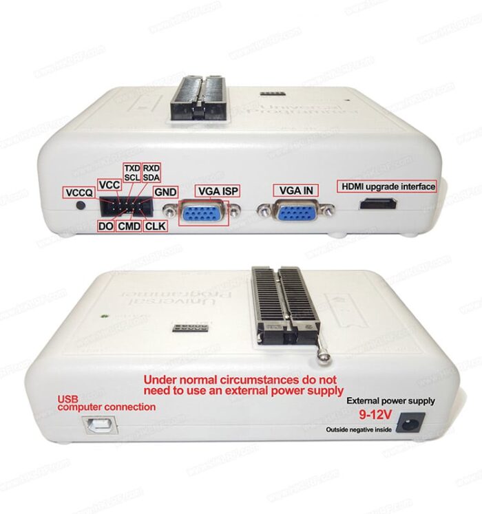 - الاتصال عبر USB 2.0 عالي السرعة: تتصل RT809H بجهاز الكمبيوتر عبر منفذ USB عالي السرعة، وتستخدم برامج تشغيل وتطبيقات قوية (مثل برنامج RT809H المخصص) للتواصل مع الشرائح.