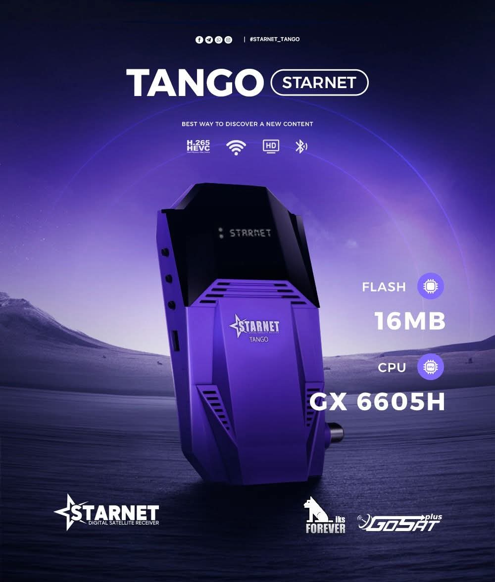 يتميز جهاز STARNET TANGO بدعمه الكامل لتقنية 4K، ومعالج GX 6605H القوي، وذاكرة فلاش 16 ميجابايت، وذاكرة DDR3 بحجم 1 جيجابايت. كما يضم سيرفرات مجانية متعددة مثل سيرفر Forever وGoSat.